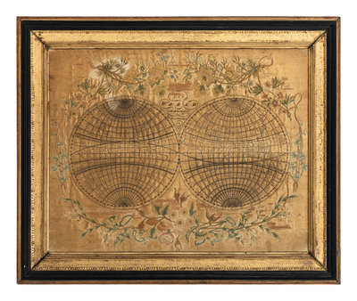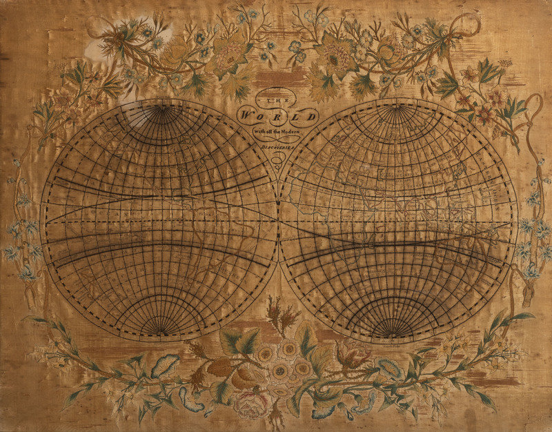 presented in two hemispheres and identified The World with All the Modern Discoveries after an eponymous map drawn by J. Young Georg and published in Young's Atlas, A New Atlas Or a Compleat [sic] Set of Maps Representing the different Empires, Kingdoms & States of the Known World Including all the Modern Discoveries by John Ainslie, Edinburgh, and W. Faden, London, in 1778.