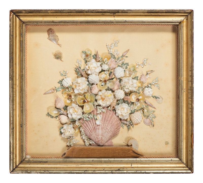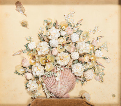 A Shellwork Composition Depicting a Floral Bouquet and Butterflies
