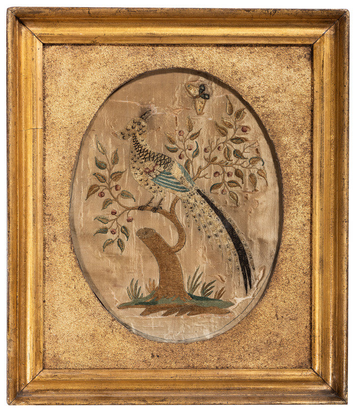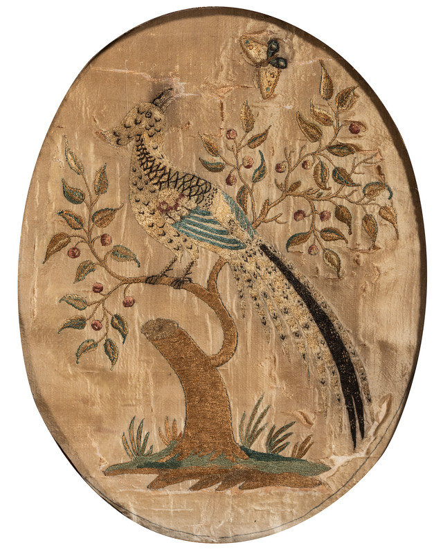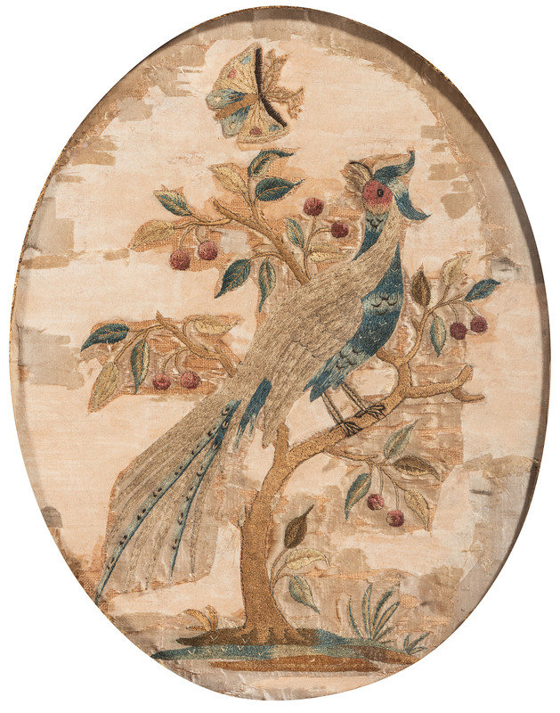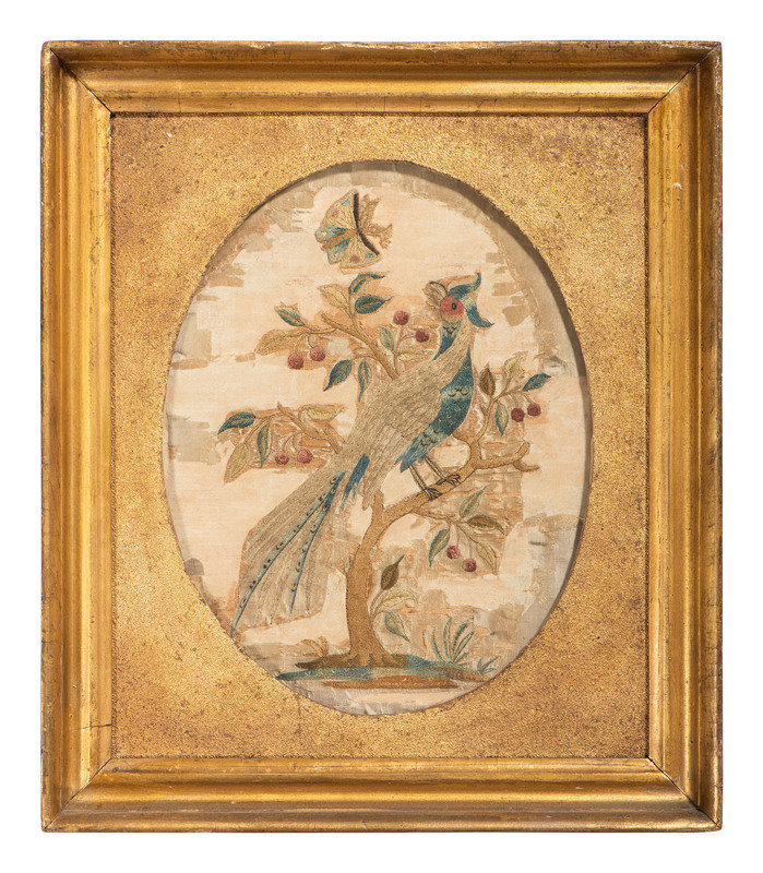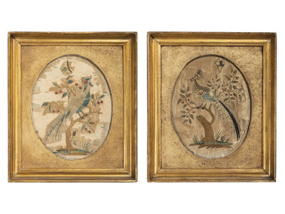 A Pair of Needlework Embroidered Pictures of Perched Birds with Butterflies