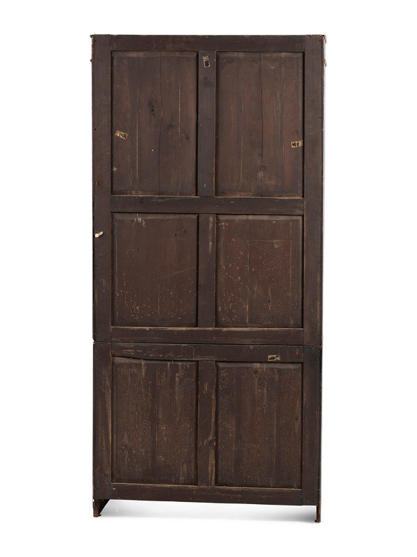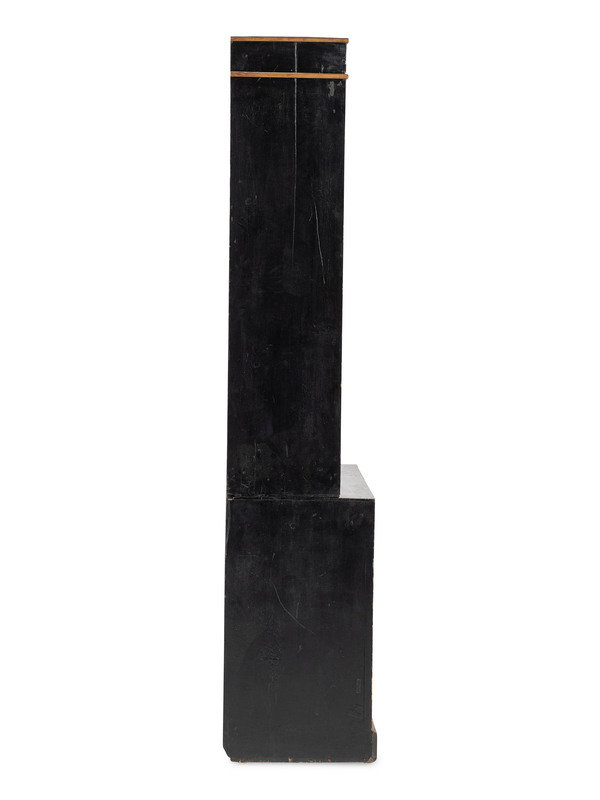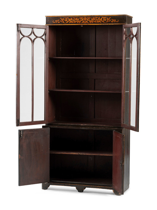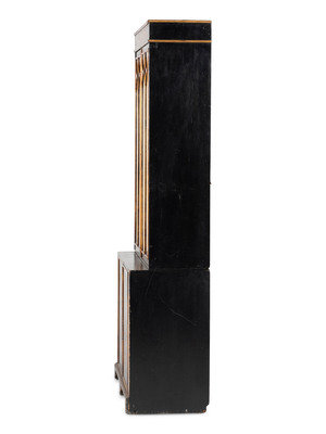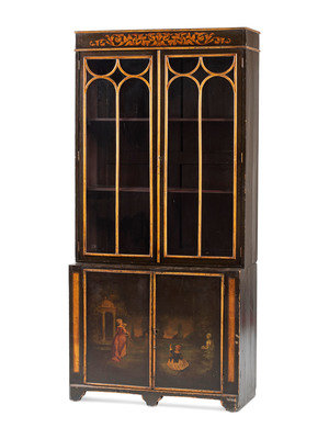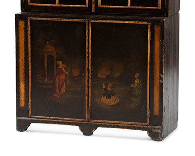 A Regency Black Lacquered and Parcel Gilt Vernis Martin Decorated Step-Back Cabinet