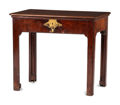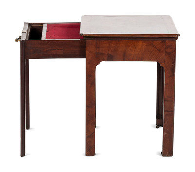having pull-out section with lined writing surface and lift-up compartment, appears to retain the original brasses and key.
