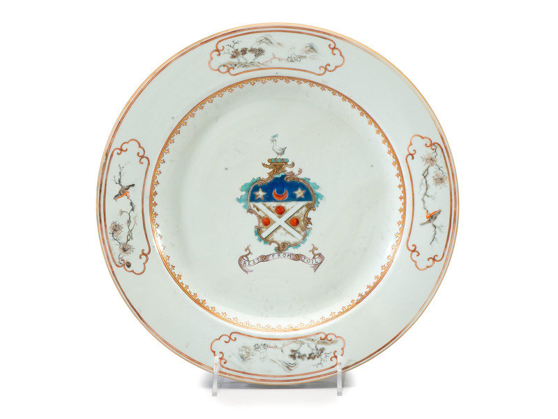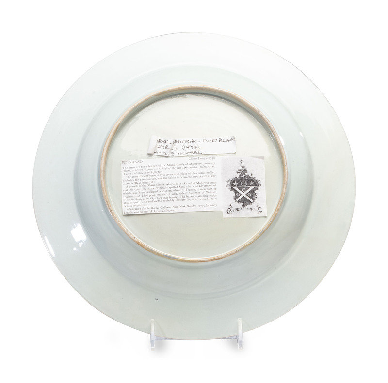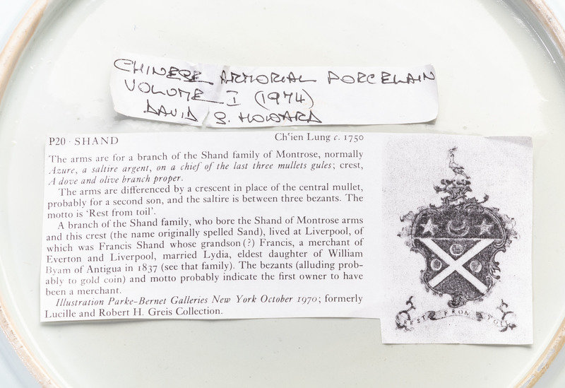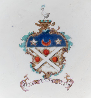 centered with the arms of the Shand family, the border decorated with four cartouches with birds at the cardinal directions.