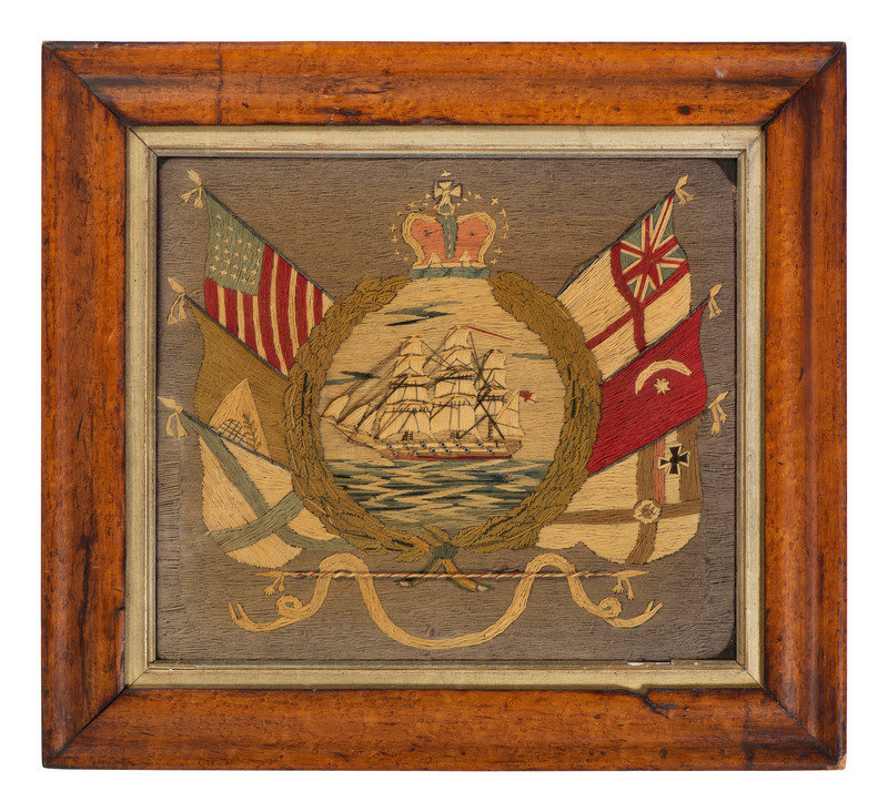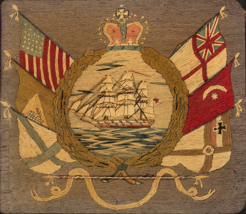 depicting a fully rigged ship of the line surmounted by a crown, enclosed by a wreath, and flanked by international flags.