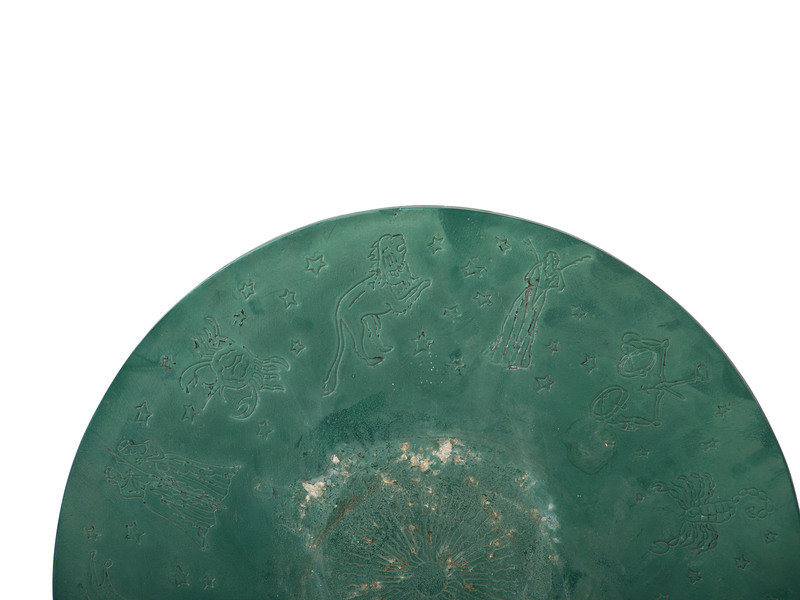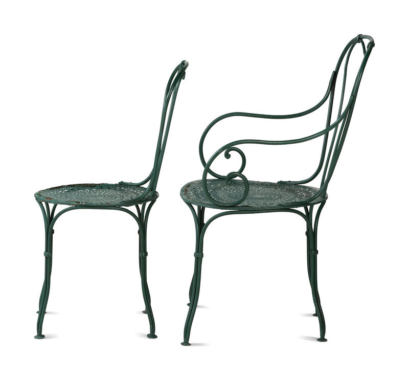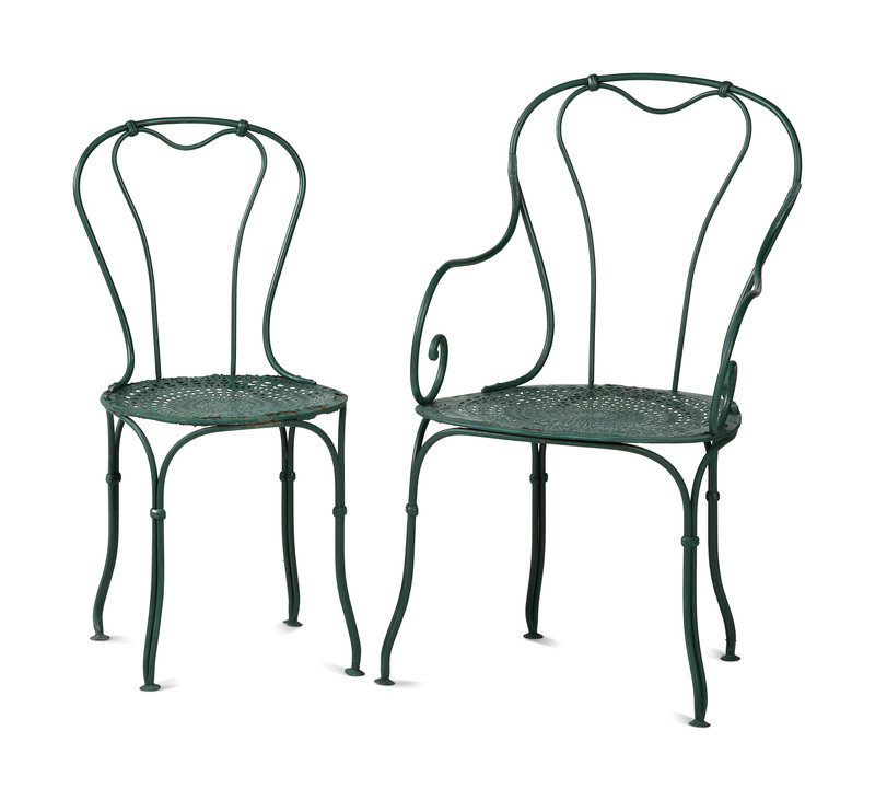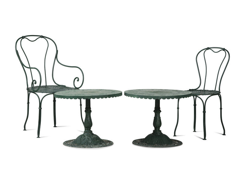 A Pair of Painted Metal Zodiac Patio Tables and Chairs