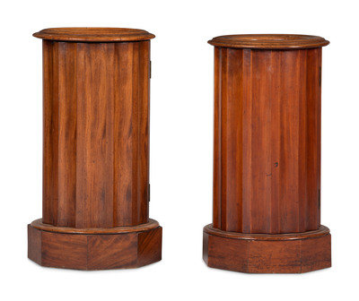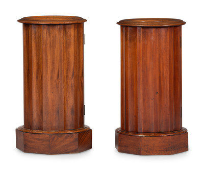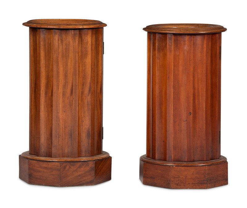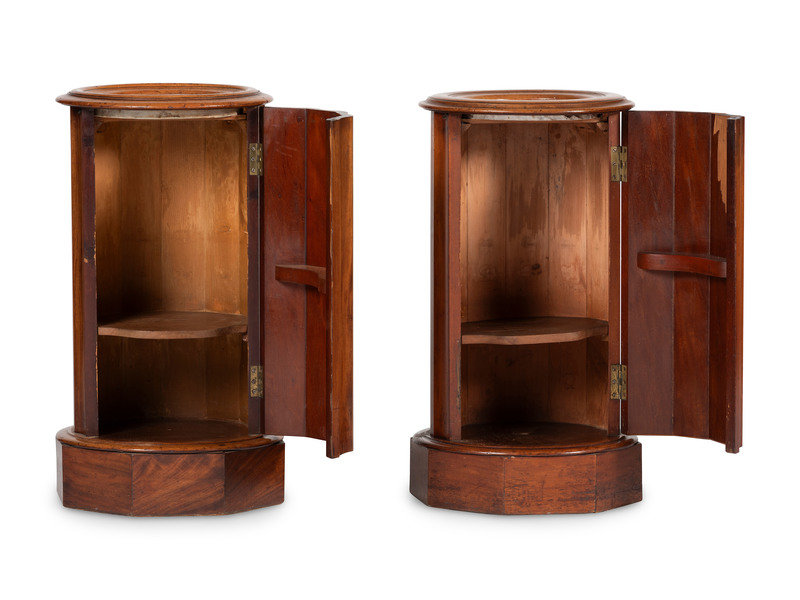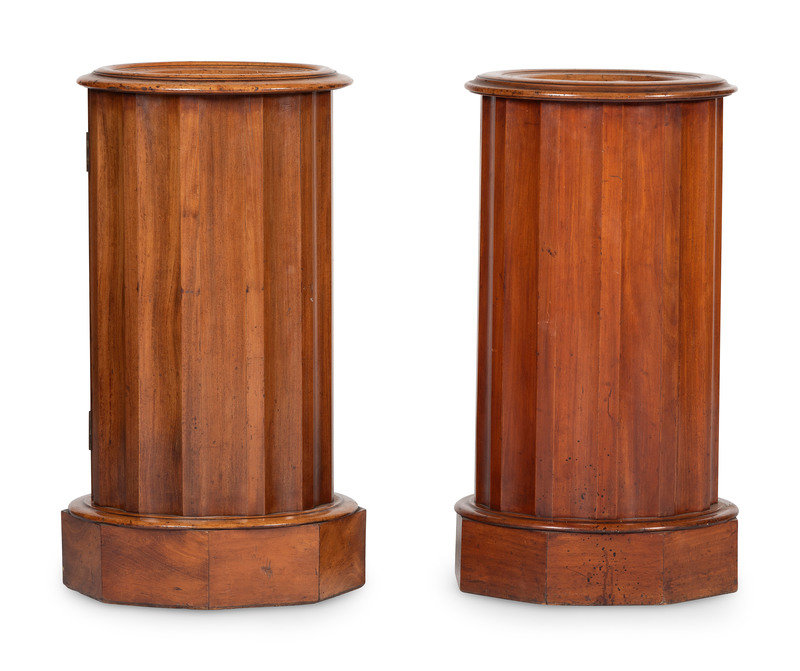A Pair of Regency Style Marble Inset Carved Birch Column-Form Pot Cupboards