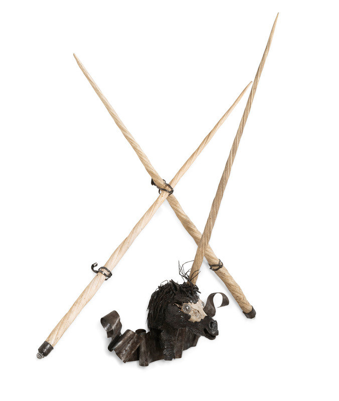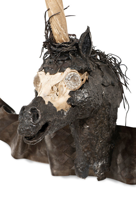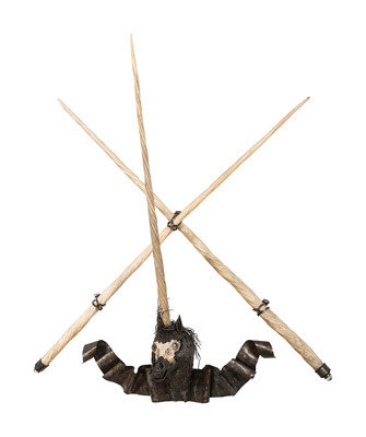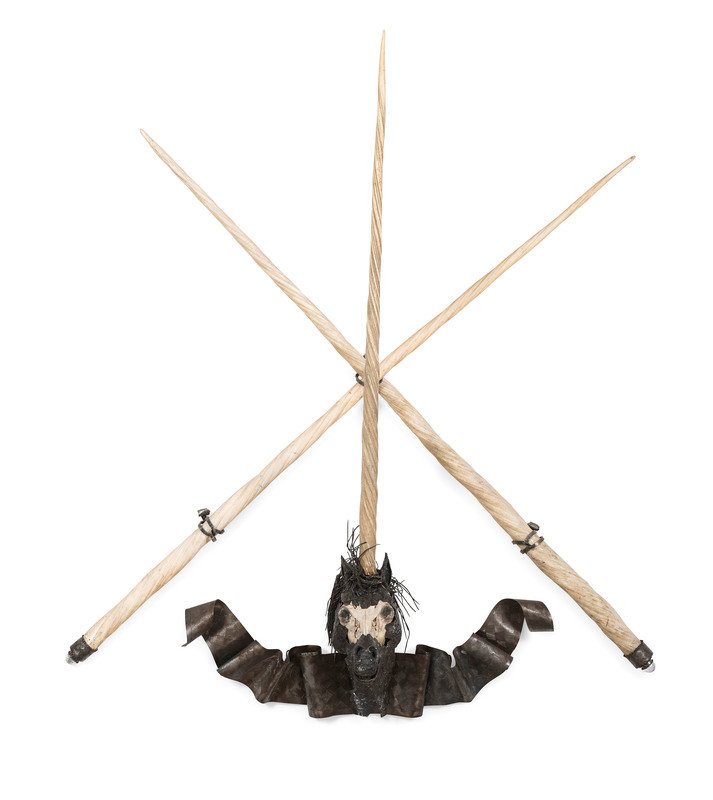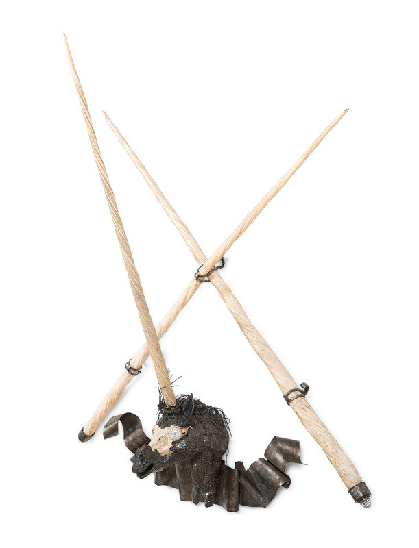 constructed of a partial horse skull set in a cast metal ribbon form back issuing a narwhal tusk, with two additional tusks crossed above.