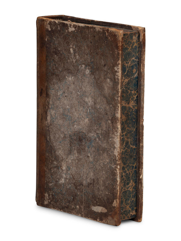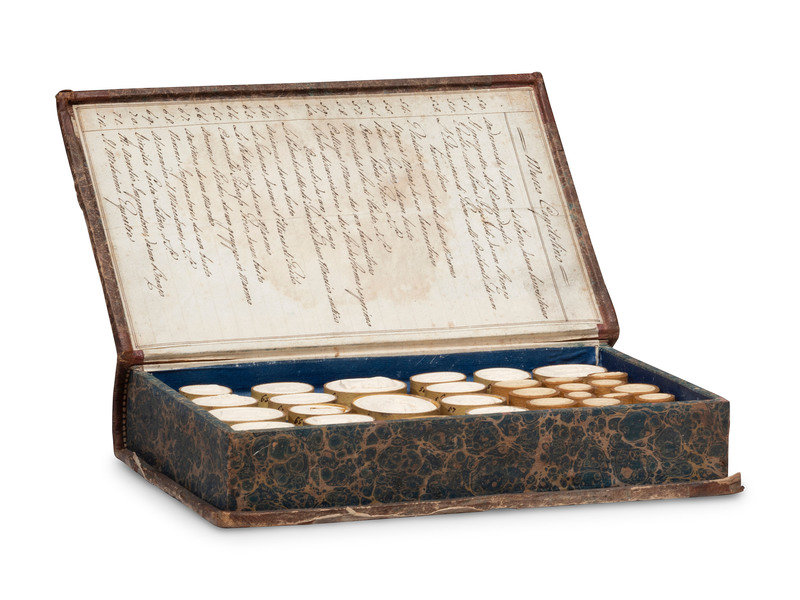 housed in a faux book box, with handwritten table of contents to the inside covers and gilt-tooled leather bindings.