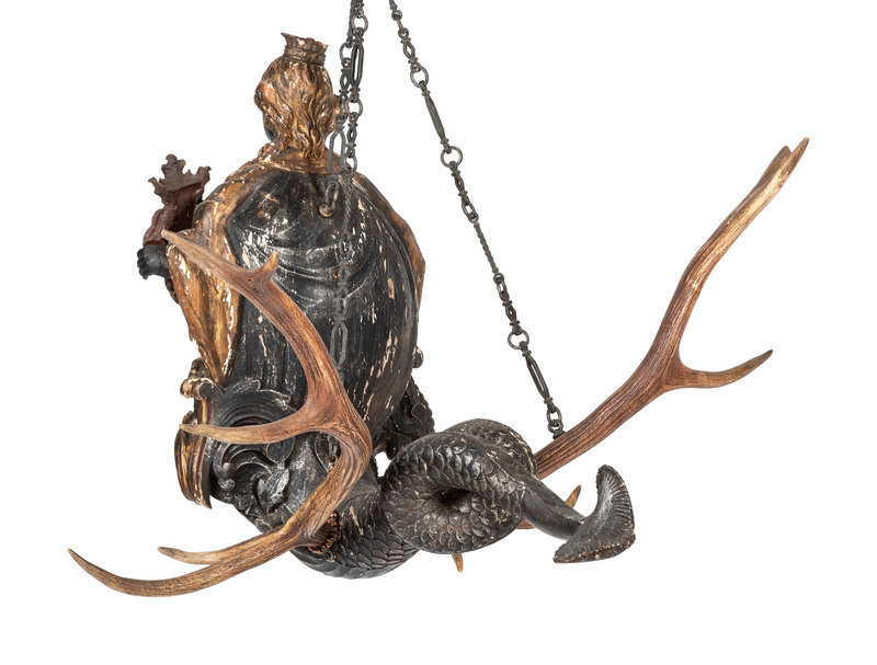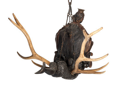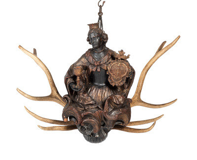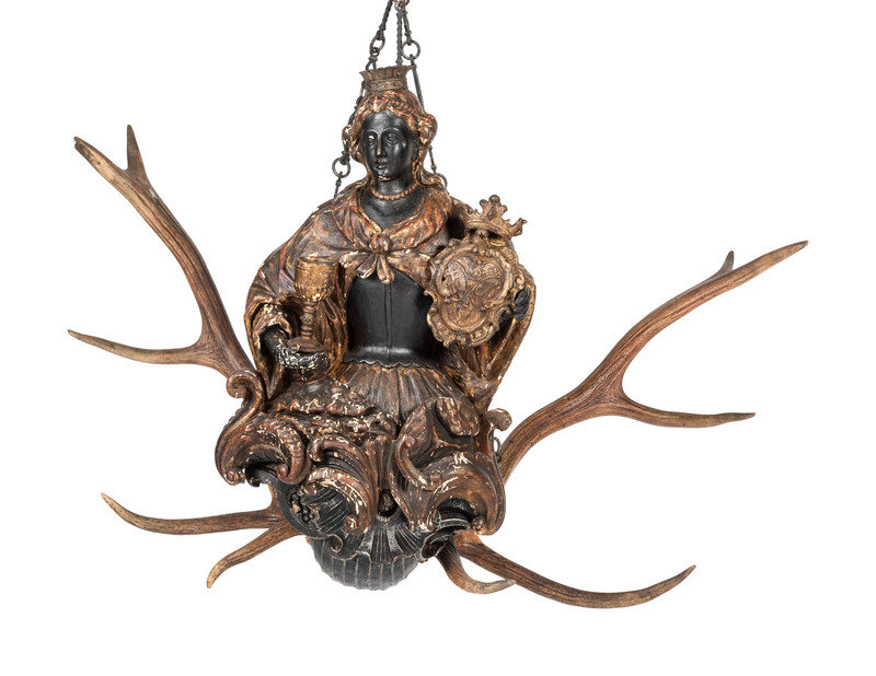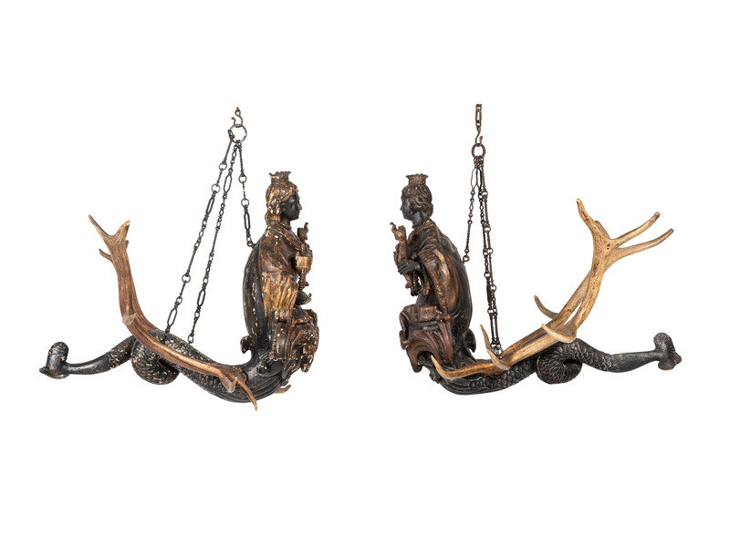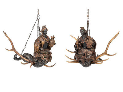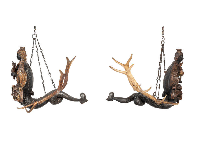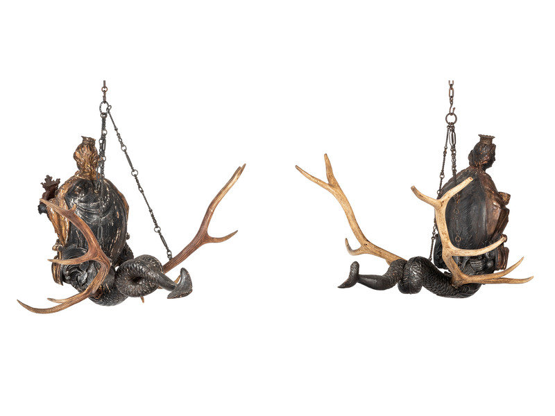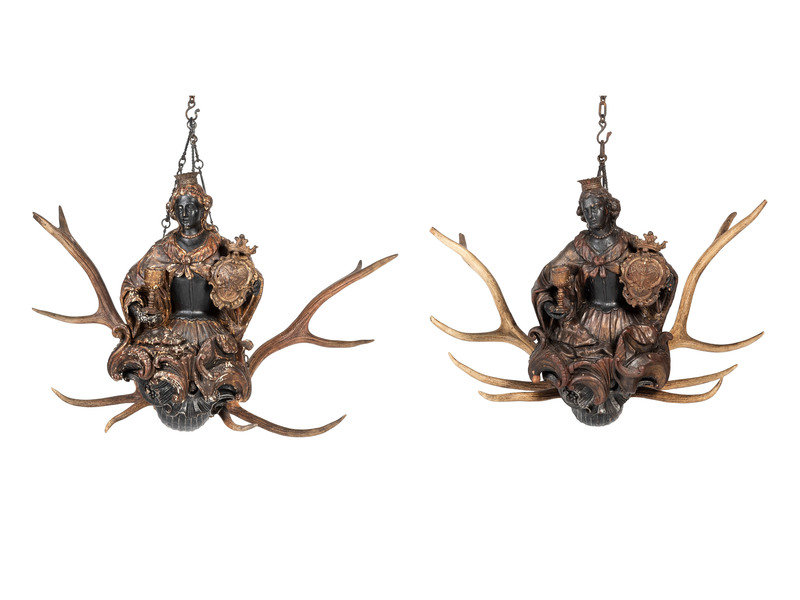 A Pair of Painted Wood and Antler-Mounted Lusterweibchen Chandeliers