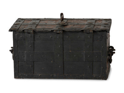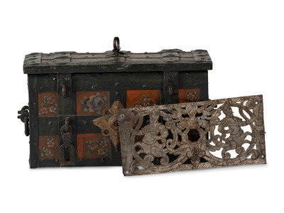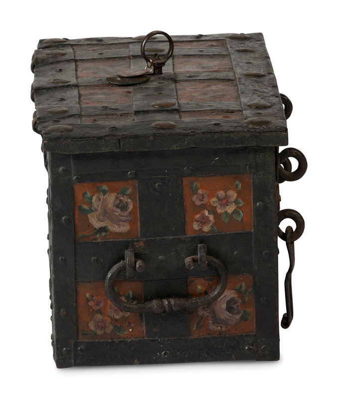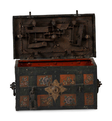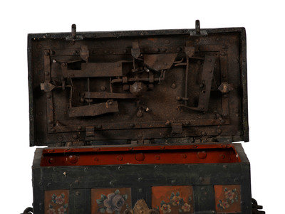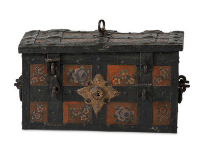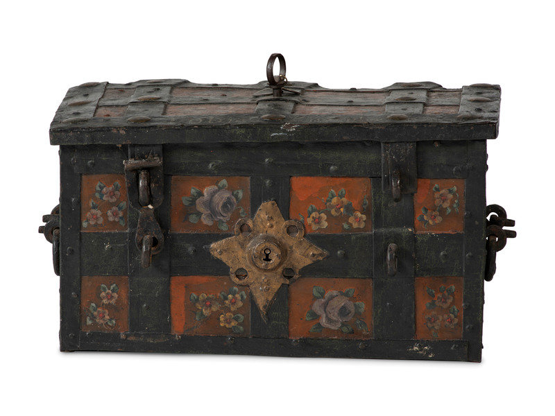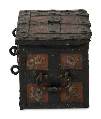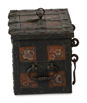 A Continental Paint-Decorated and Iron Mounted Strong Box