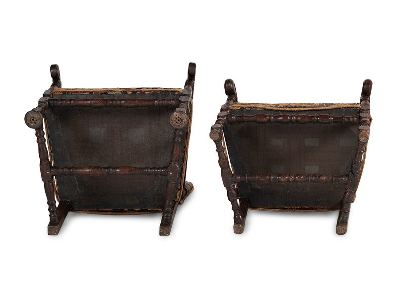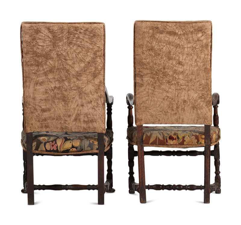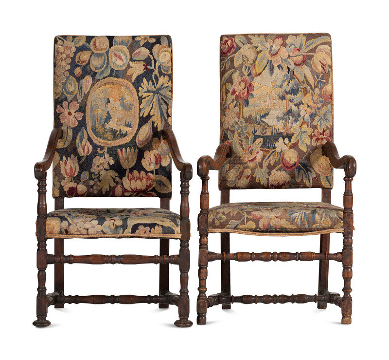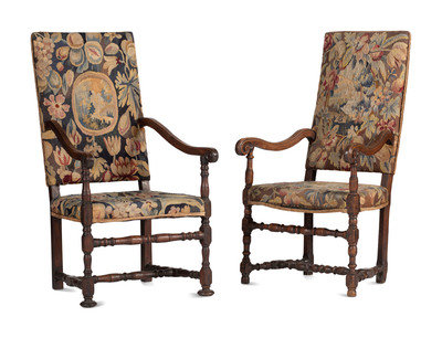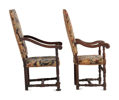 A Matched Pair of French Scroll-Carved and Turned Walnut Tapestry Upholstered Fauteuils