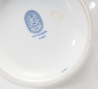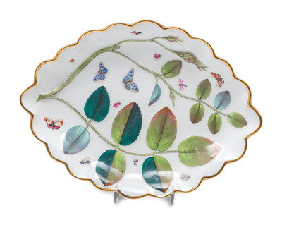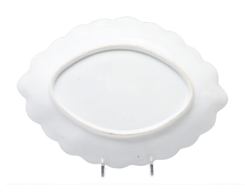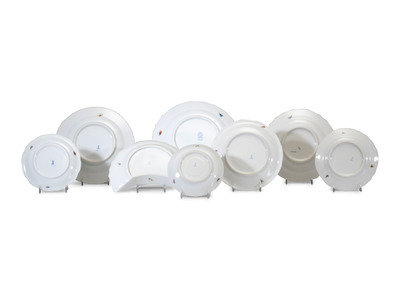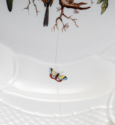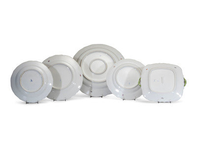 together with two Meissen bird luncheon plates each with double cancellation marks through crossed swords and two unmarked scalloped-rim lozenge form dishes;