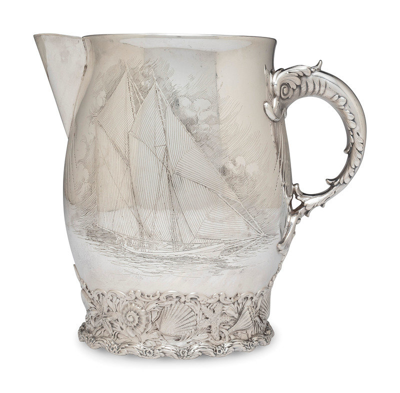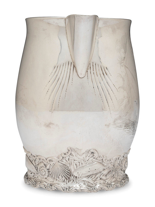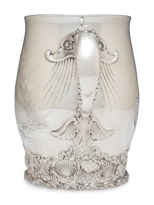 having a dolphin-form handle, the body engraved with a scene of a sailing ship and raised on a foot decorated with seashells and other marine motifs.