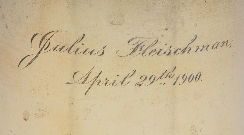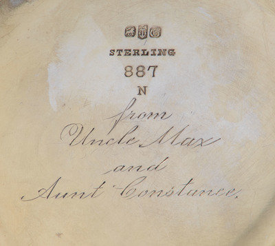 the body decorated in the form of a bamboo chute with a similarly decorated handle, the body engraved 'Julius Fleischman, April 29th, 1900' the underside engraved 'From Uncle Max/ and/ Aunt Constance'.