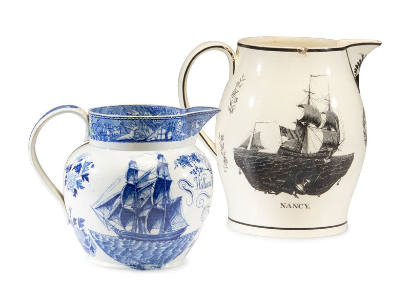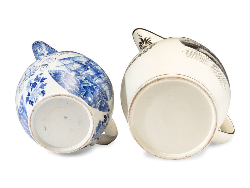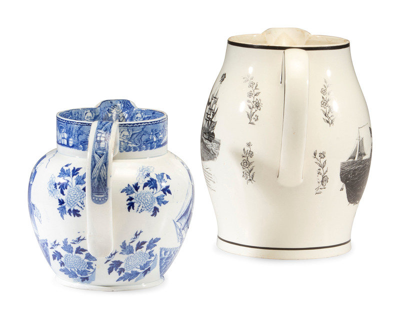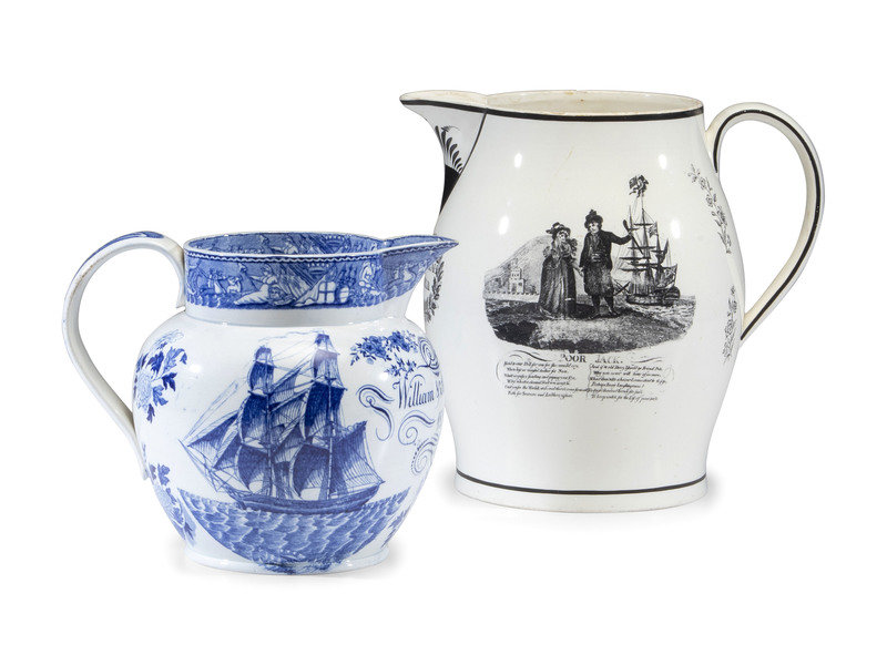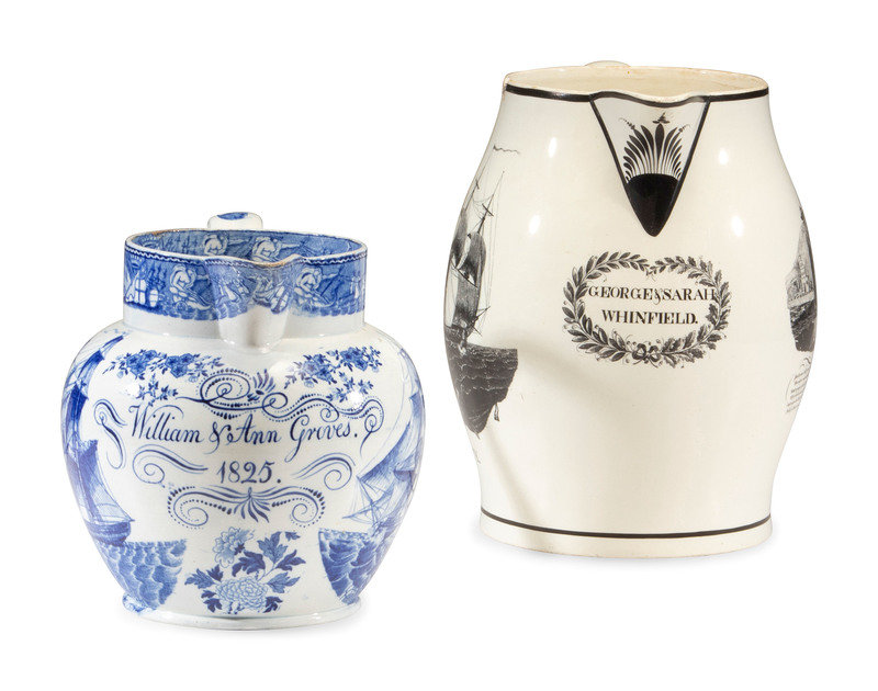 together with a blue transfer-decorated jug depicting a ship on either side and 'William & Ann Groves 1825' on the front.