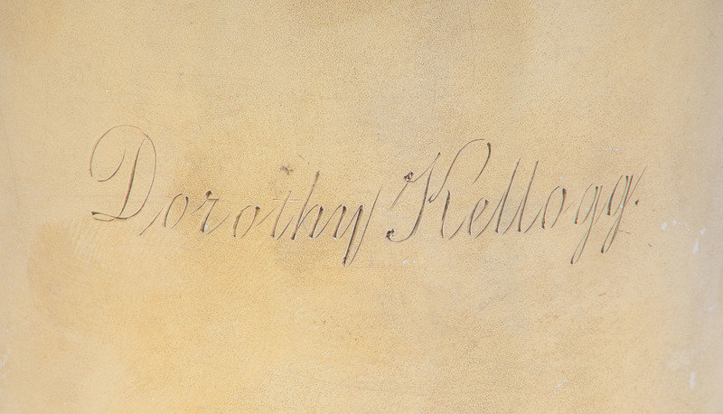 comprising an example with beaded rims and an engraved monogram on body, the other example with a banded foot decorated with children's nursery rhyme motifs, the body engraved 'Dorothy Kellogg', the third example decorated with Tudor strapwork motifs.