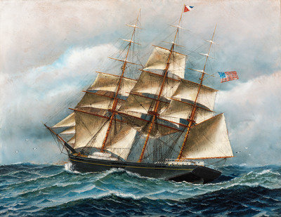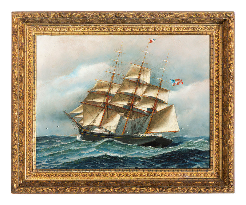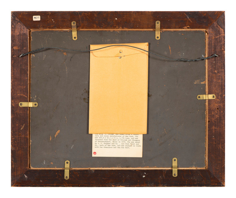 Antonio Jacobsen painted at least two other known views of the L. Schepp, each depicting the ship in heavy weather with damaged rigging. One such iteration, American Ship "L. Schepp" in a Typhoon off Bellona Reef, New Caledonia, nearly twice the size of this painting, was held privately by Bert Kutakof of Pearl Harbor, Hawaii until 1949, when it privately changed hands. The work was offered as Lot 51 in Sotheby's American Paintings, Drawings, and Sculpture auction in 2003, and later as Lot 747 in Eldred's Americana auction in 2006. The painting offered here has been in the possession of the Fleischmann family since at least 1985 per correspondence with the late Harold Sniffen, Curator Emeritus of the Mariners' Museum, Newport News, Virginia.