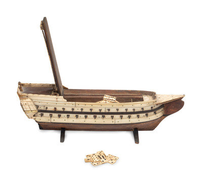 cover on boat deck opens to reveal twenty-five bone dominoes.