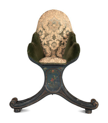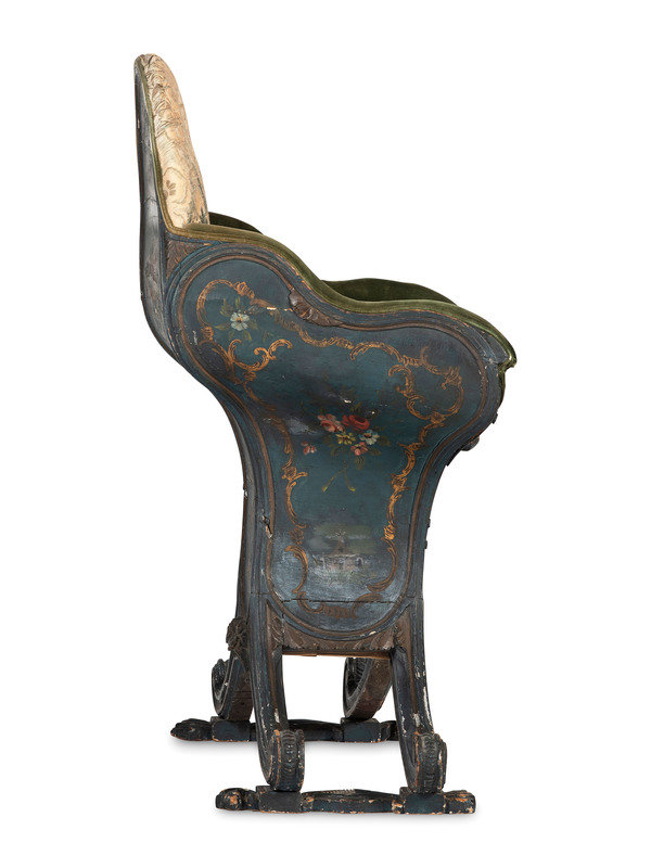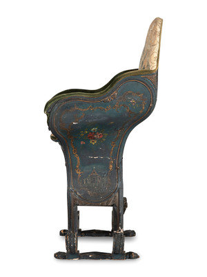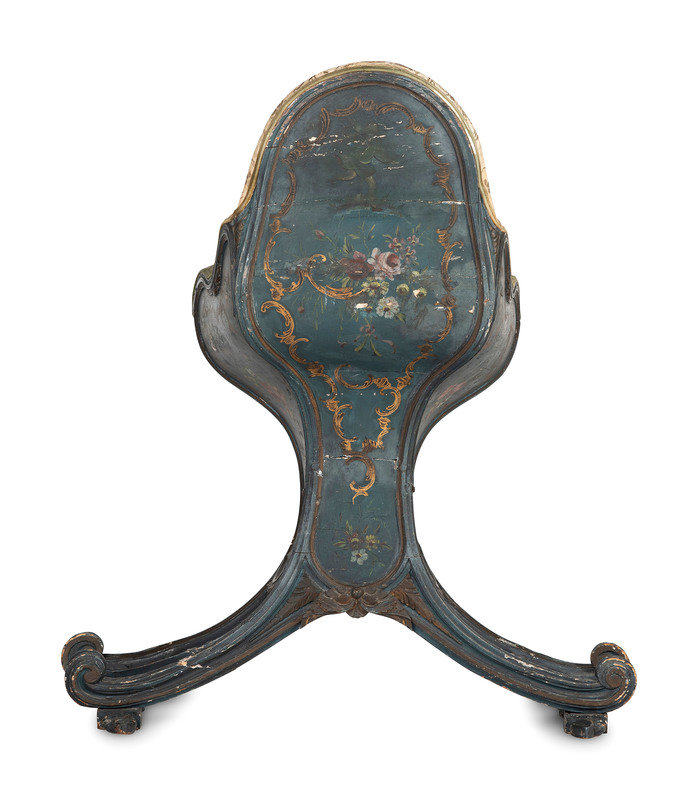 A Venetian Blue and Polychrome Decorated Parcel Gilt and Carved Wood Gondola Chair