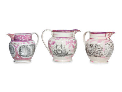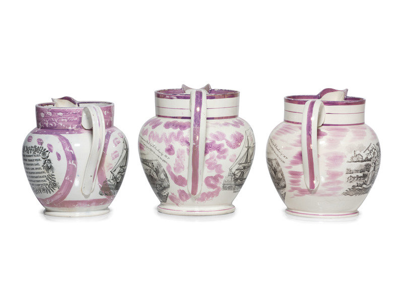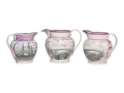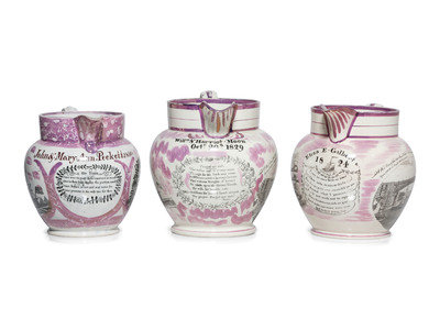 comprising one jug with farmers' coat of arms and inscription for Eliza Gilbert / 1824; and two marriage jugs inscribed for John & Mary Ann Peckett, 1850 and Willm. & Harriott Moon, 1829.