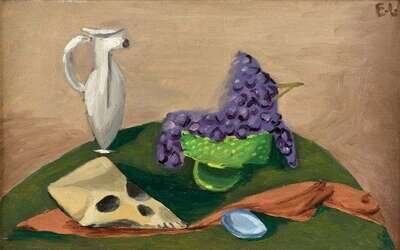 EDGAR LEVY (AMERICAN 1907-1975) TABLETOP STILL LIFE WITH SKULL, PITCHER AND GRAPES