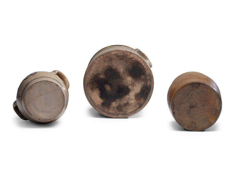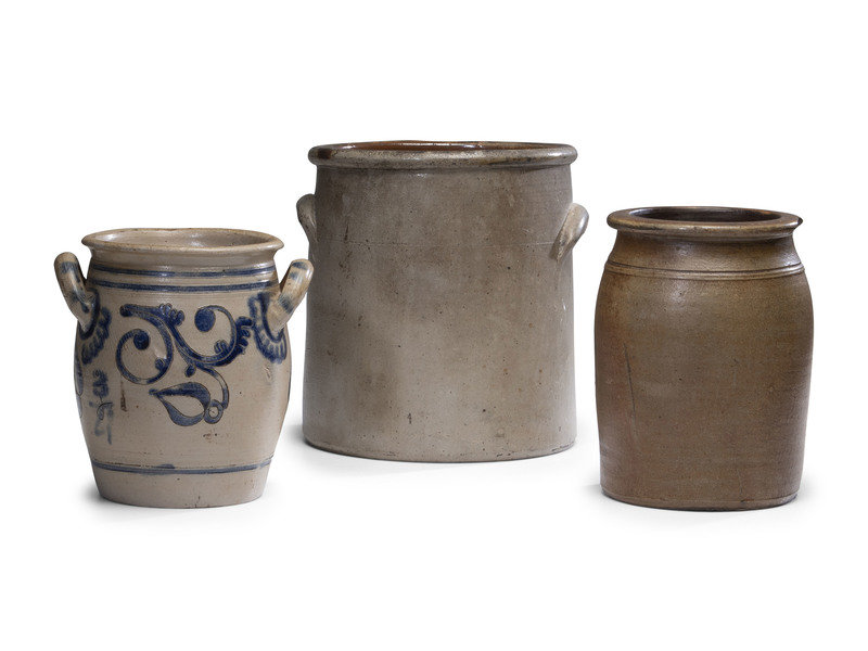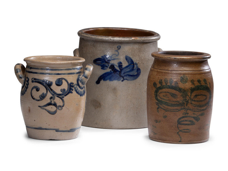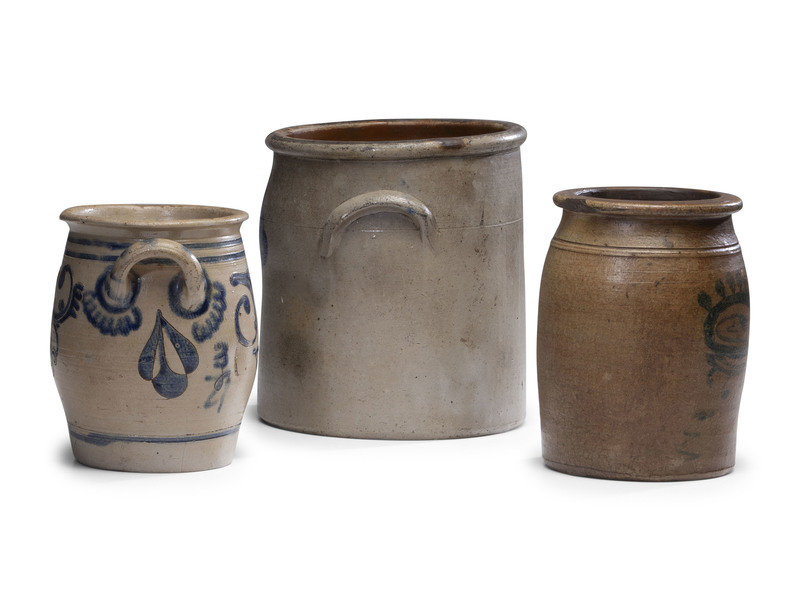 comprising a three gallon crock and a jar with freehand cobalt decoration, and a handled Westerwald jar.