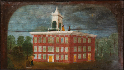 panel is the interior lid of a blanket or tool chest, depicting a public building.