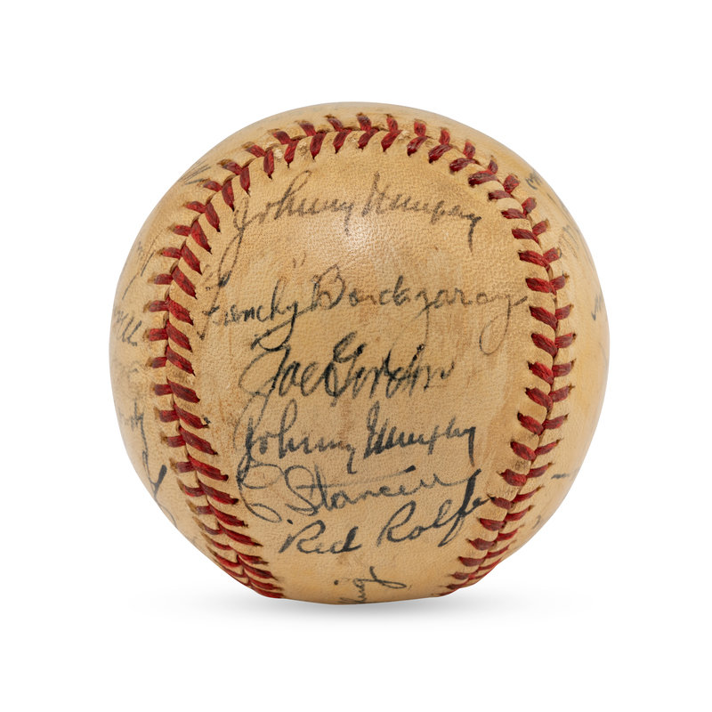 Includes Joe DiMaggio, Red Ruffing, Phil Rizzuto, Joe Gordon. Also signedd by Ken Silvestri (2x), Ernie Bonham, Tom Henrich, Atley Donald, John Sturm, Charlie Keller, Marius Russo (2x), Steve Peek, Spud Chandler, Marvin Brewer (2x), John Schulte, Buddy Rosar, Norm Branch, Jerry Priddy, Johnny Murphy (2x), Frenchy Bordagaray, Charley Stanceu. The signature of Red Rolfe has been deemed a clubhouse version.