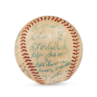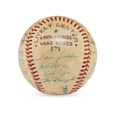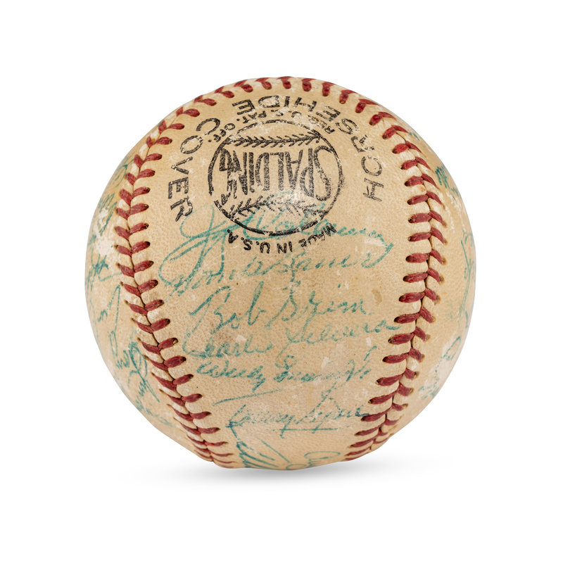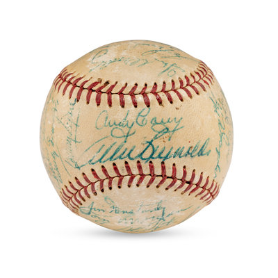Includes Yogi Berra, Mickey Mantle, Phil Rizzuto, Enos Slaughter. Also signed by Andy Carey, Allie Reynolds, Jim Konstanty, Tom Morgan, Jim McDonald, Tom Gorman, Harry Byrd, Irv Noren, Ed Robinson, Ralph Branca, Art Schallock, John Sain, Gene Woodling, Joe Collins, Bill Skowron, Bob Cerv, Gil McDougald, Jerry Coleman, Hank Bauer, Bob Grim, Charlie Silvera, Tommy Brown, Willy Miranda