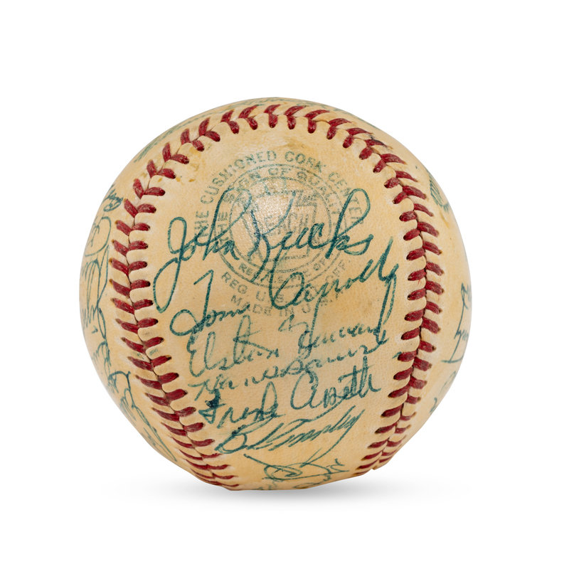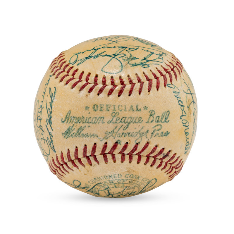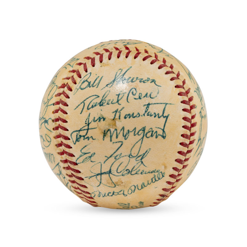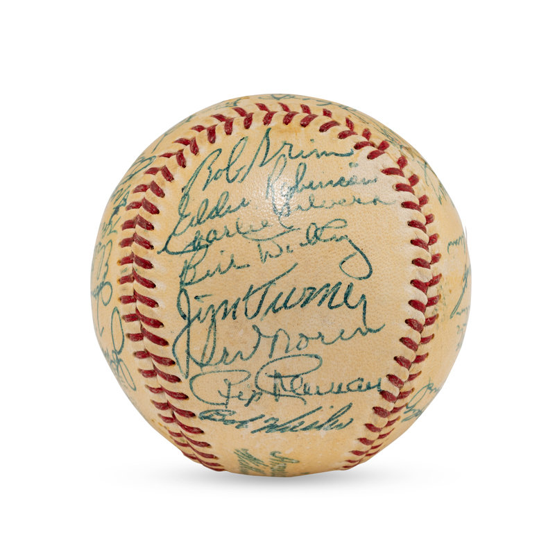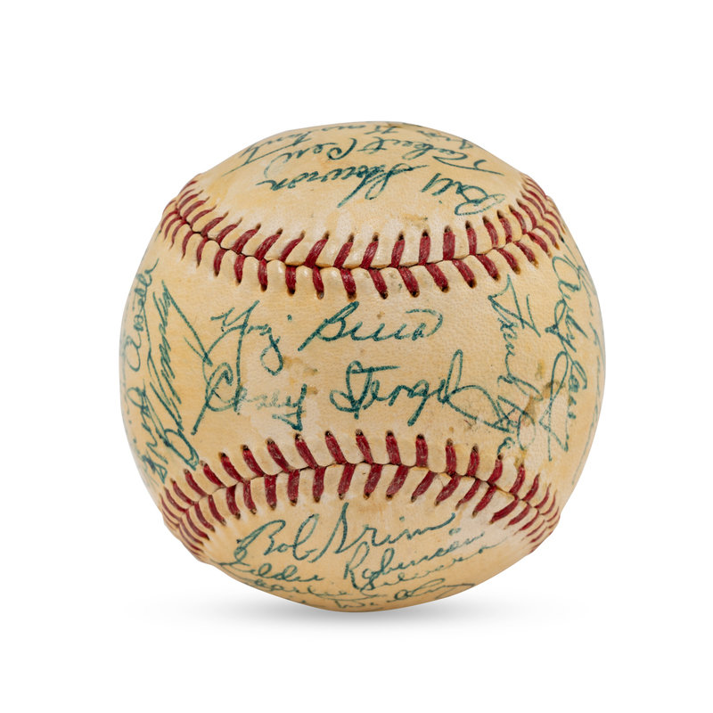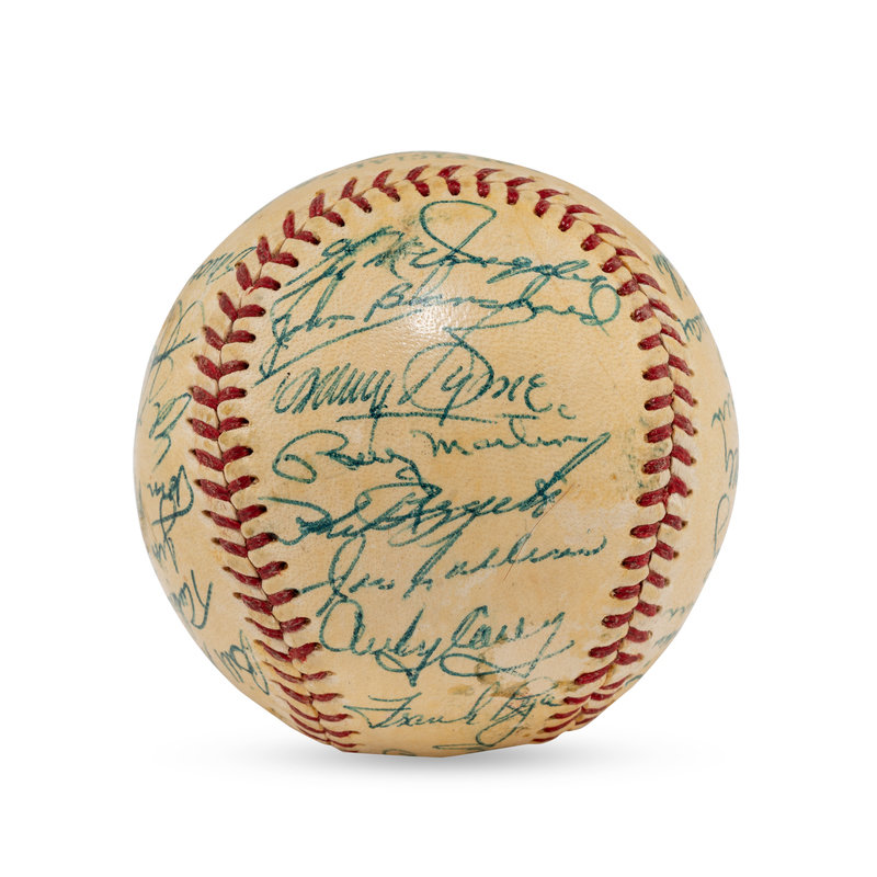 Includes Mickey Mantle, Yogi Berra, Bill Dickey, Phil Rizzuto, Whitey Ford. Also signed by Elston Howard, Billy Martin, Bob Grim, Eddie Robinson, Charlie Silvera, Jim Turner, Irv Noren, Rip Coleman, Bob Wiesler, Jerry Coleman, Tom Morgan, Jim Konstanty, Bob Cerv, Bill Skowron, Gil McDougald, John Blanchard, Tommy Byrne, Joe Collins, Andy Carey, Frank Leija, Bob Turley, Frank Crosetti, Hank Bauer, Tom Carroll and Johnny Kucks. The signature of Casey Stengel has been deemed a clubhouse version.