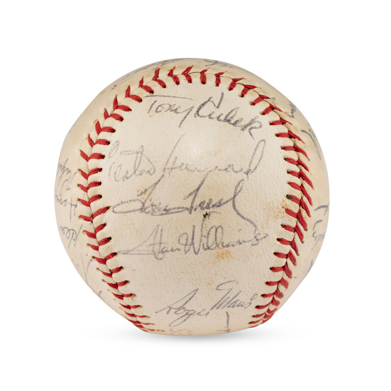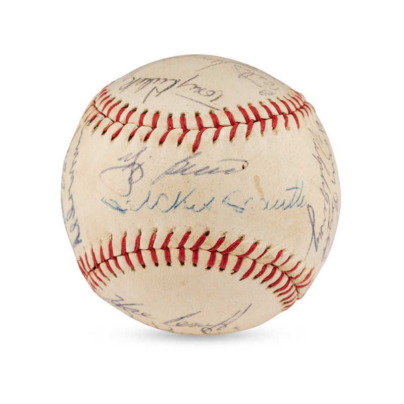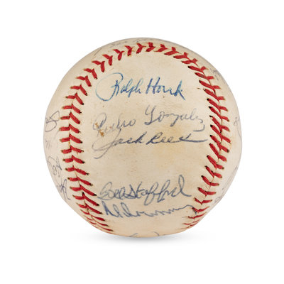 Includes Yogi Berra. Also signed by Bobby Richardson, Ralph Houk, Pancho Gonzalez, Bob Stafford, Jake Reed (2x), Al Downing, Ralph Terry, Hector Lopez, Jim Bouton, Steve Hamilton, Tony Kubek, Elston Howard, Tom Tresh, Stan Williams, Hal Reniff, Jake Gibbs, Bill Kunkel. The signatures of Mickey Mantle, Roger Maris and Harry Bright have been deemed clubhouse versions.