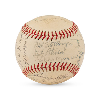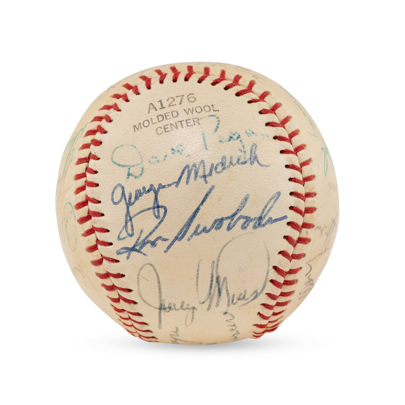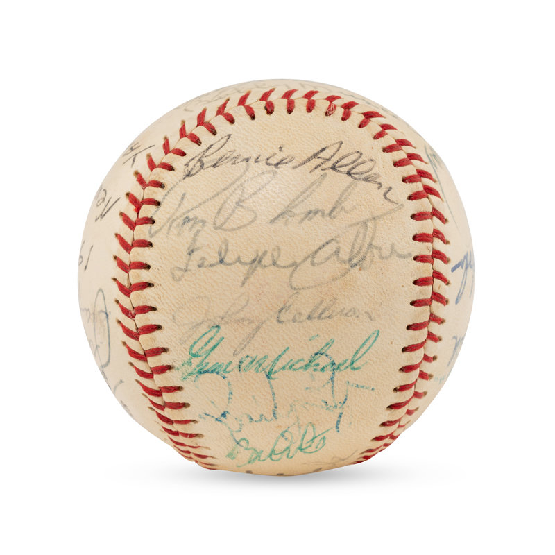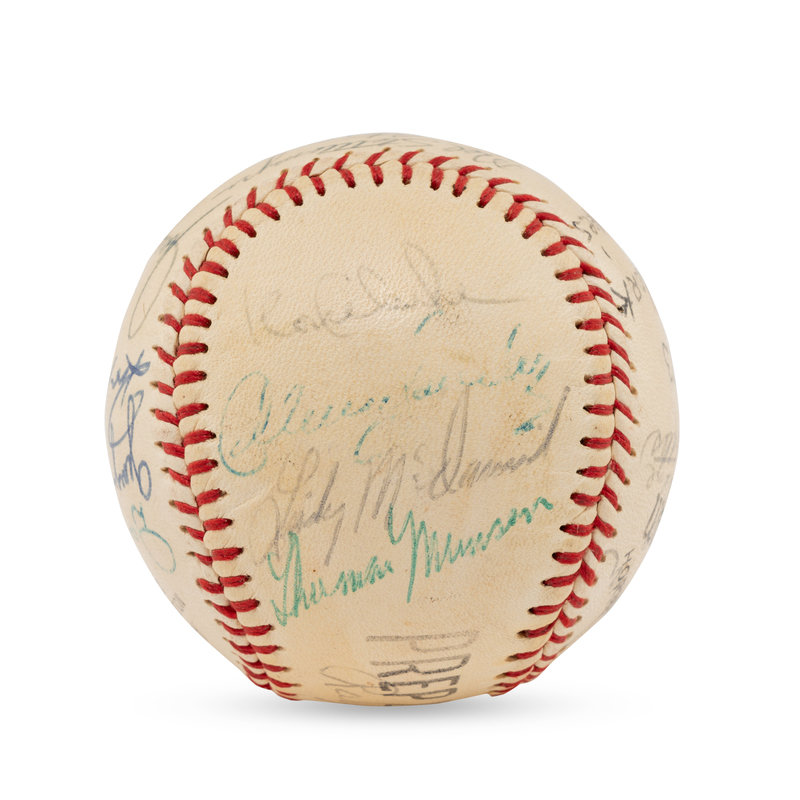 Includes Fred Beene, Pat Dobson, Graig Nettles, Jerry Moses, Ron Swoboda, George Medich, Dave Pagan, Horace Clarke, Lindy McDaniel, Celerino Sanchez, Bernie Allen, Ron Blomberg, Felipe Alou, Johnny Callison, Gene Michael, Sparky Lyle, Roy White, Ralph Houk. The signatures of Thurman Munson, Bobby Murcer and Fritz Peterson have been deemed clubhouse versions.