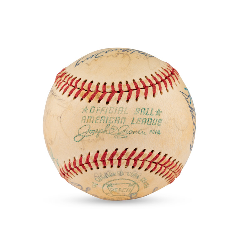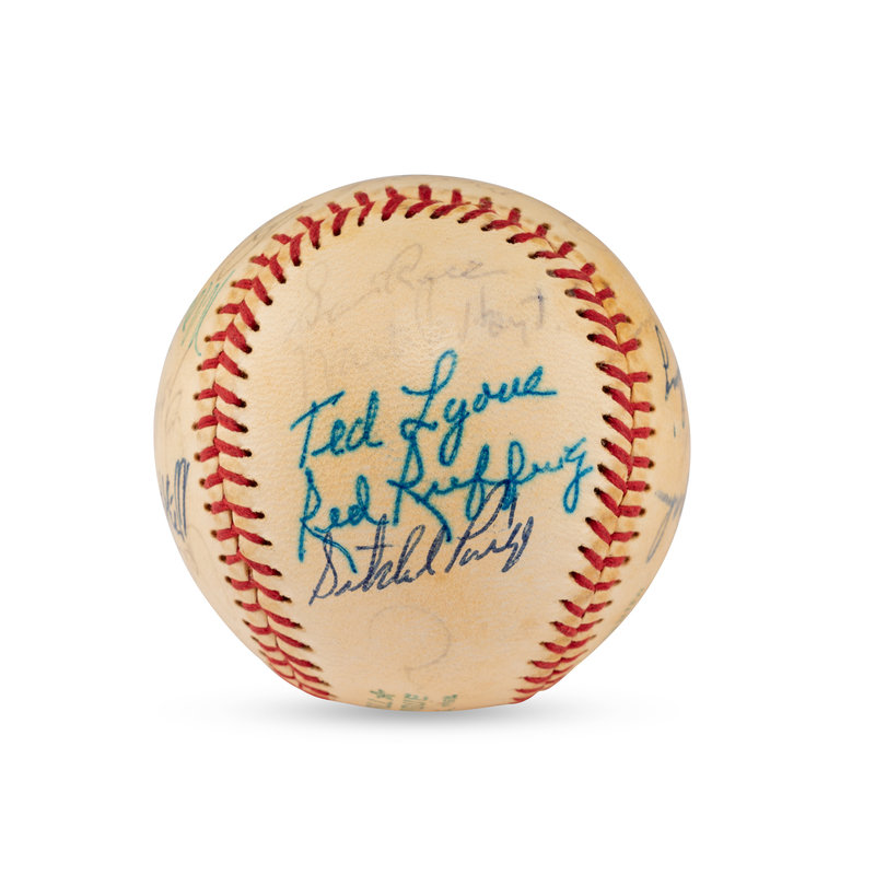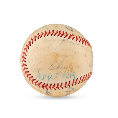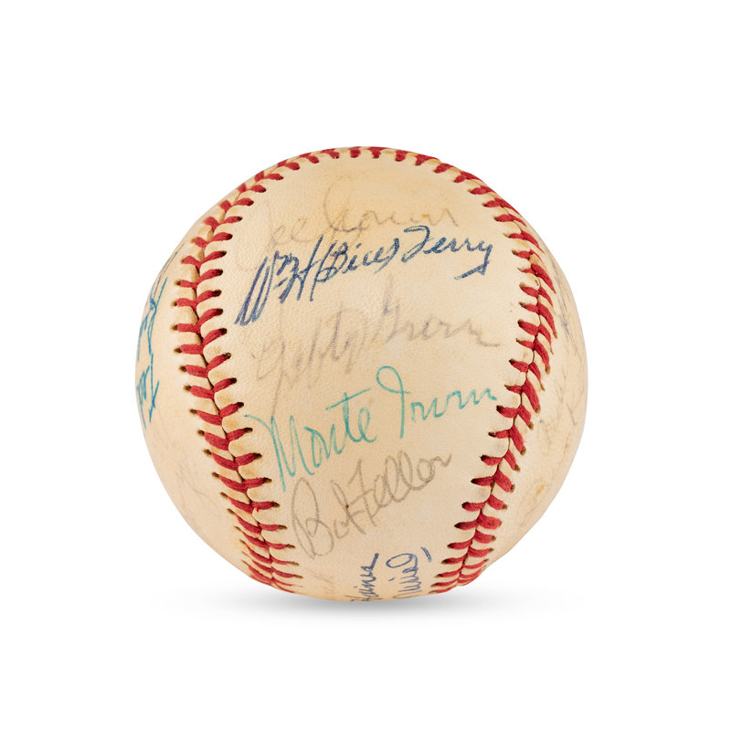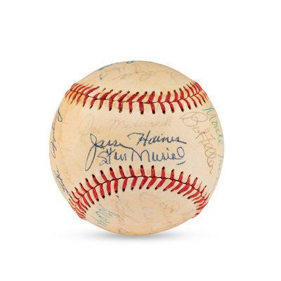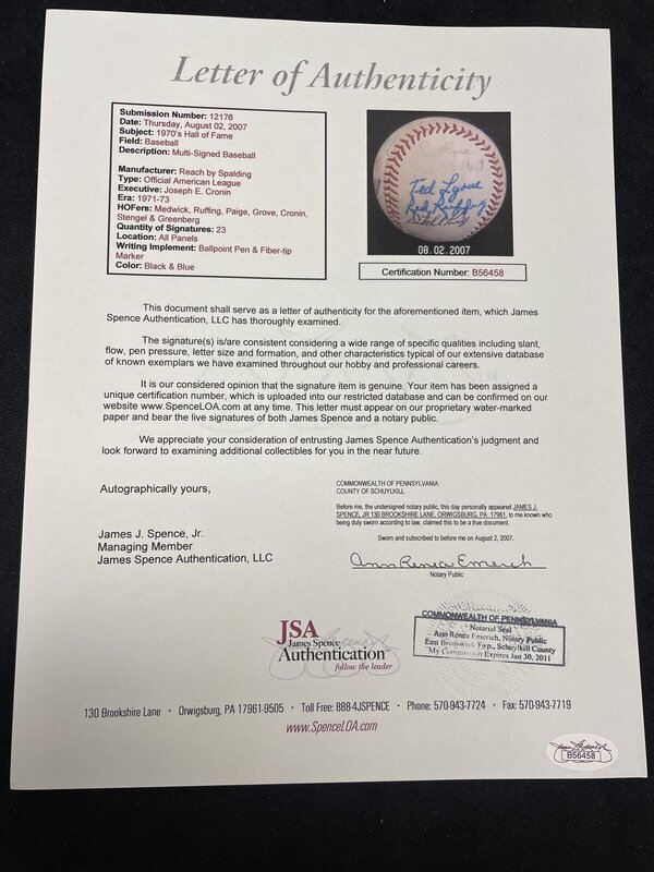 comprising 23 signatures including Joe Medwick, Jesse Haines, Stan Musial, Red Ruffing, Joe Cronin, Bill Terry, Monte Irvin, Bob Feller, Warren Spahn, Luke Appling, Ted Lyons, Red Ruffing, Satchel Paige, Buck Leonard, Casey Stengel, Charlie Gehringer, George Kelly, Hank Greenberg.