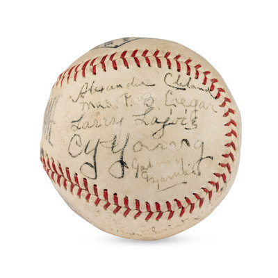 Includes Cy Young, Larry Lajoie, William Harridge, Kennesaw Landis, Johnny Evers. Also includes the signatures of Mrs. Christy Mathewson, Mrs. John J. McGraw and 5 others (unknown).