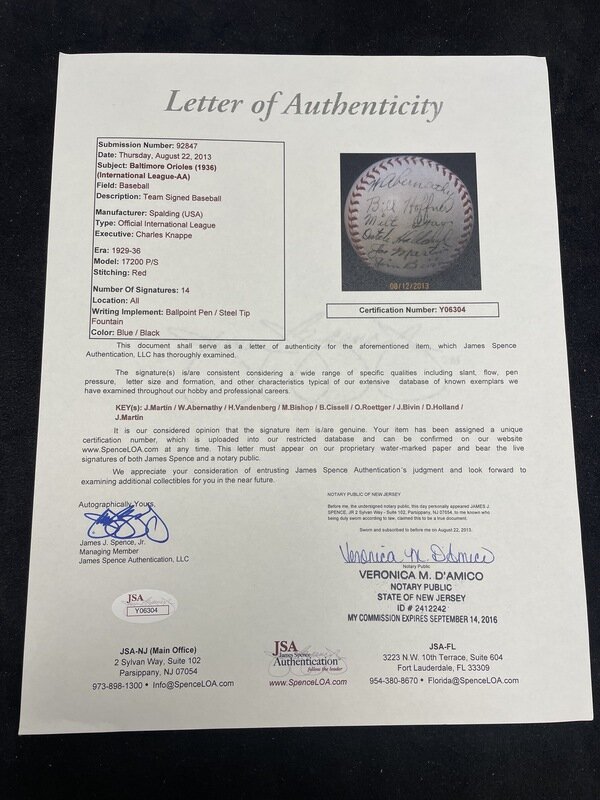 A 1936 Baltimore Orioles Team Signed Autograph Baseball (JSA Letter of Authenticity)
