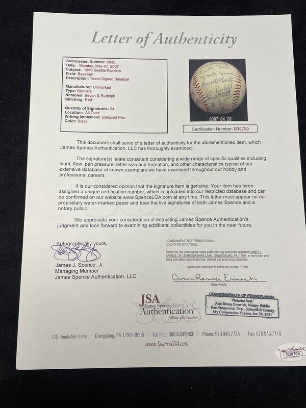 A 1959 Seattle Rainers Team Signed Autograph Baseball (JSA Letter of Authenticity)