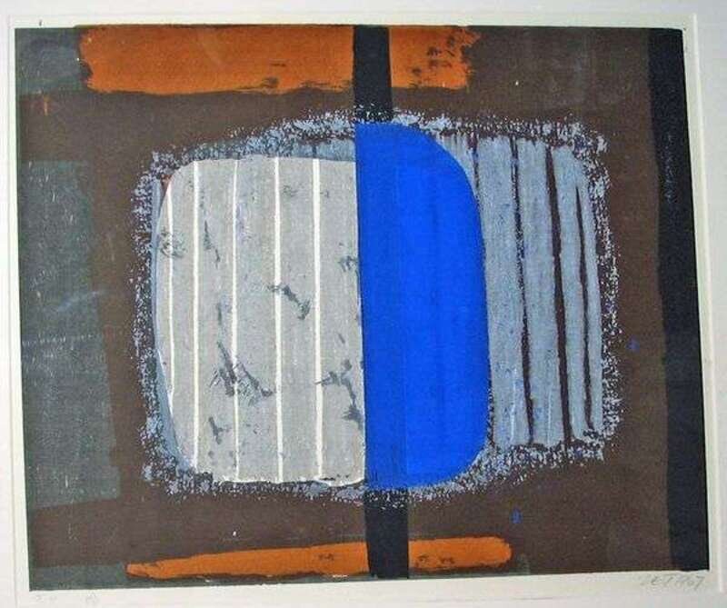 Pencil signed, titled, dated and numbered 1/6 in the margin. Color woodcut.