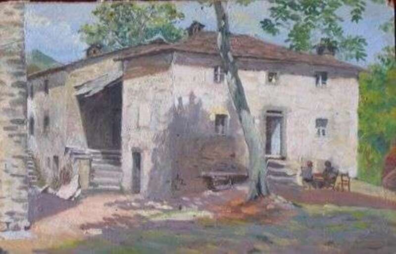 ATTRIBUTED TO PIERO FOCARDI IL PITTORE DE GARDO (ITALIAN 1889-1945) HOUSE WITH FIGURES EATING AT TABLE