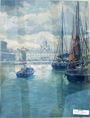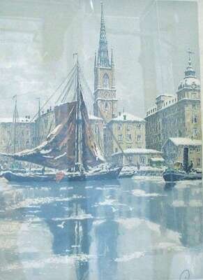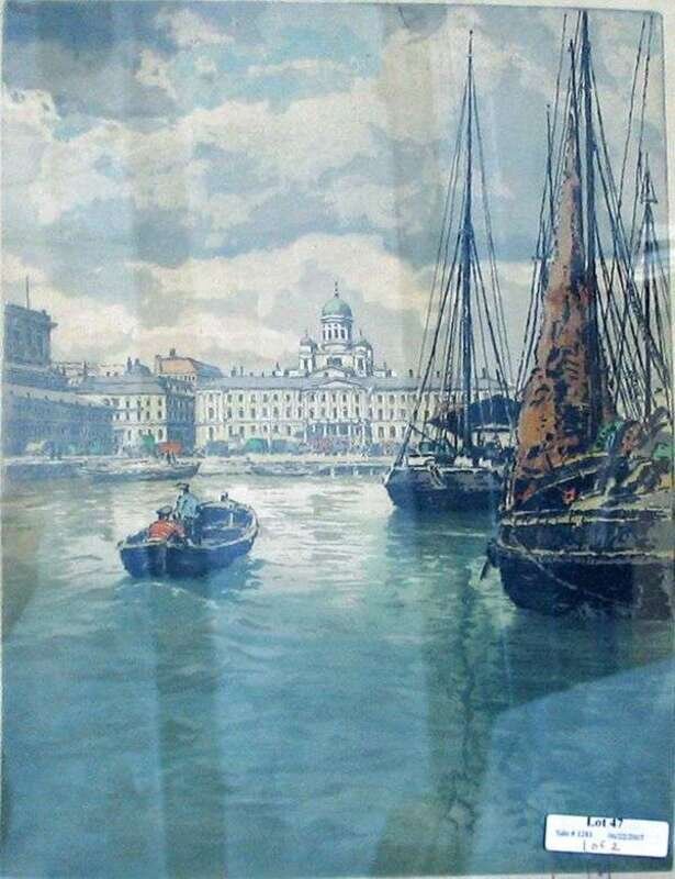 HANS FIGURA (AUSTRIAN B. 1898)TWO COLOR ETCHINGS ON SILK "STOCKHOLM, RIDDARHOLEM" and "HELSINGFORD HARBOUR"