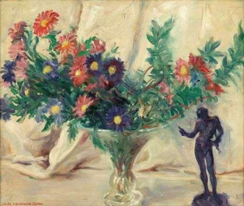 JAMES MONTGOMERY FLAGG (AMERICAN 1877-1966) STILL LIFE WITH FLOWERS AND FIGURINE