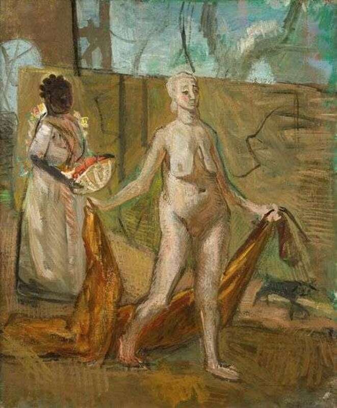 FRANKLIN WATKINS (AMERICAN 1894-1972) FEMALE NUDE WITH HANDMAIDEN AND DOG