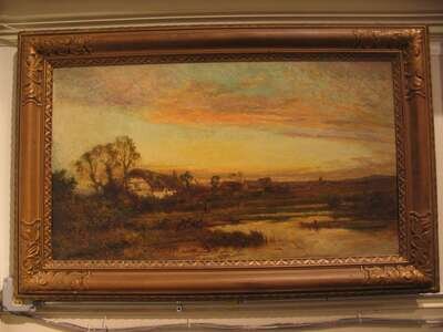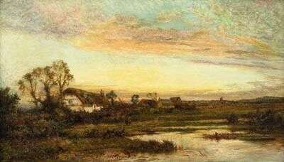 DANIEL SHERRIN (BRITISH 1868-1940) FIGURES BY A COTTAGE, SUNSET