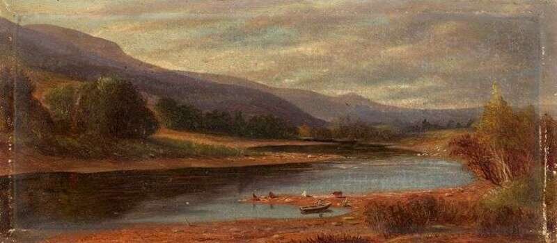 AMERICAN SCHOOL (19TH CENTURY) LANDSCAPE WITH BOATER AND COW AT RIVER'S EDGE, BELIEVED TO BE THE SUSQUEHANNA RIVER