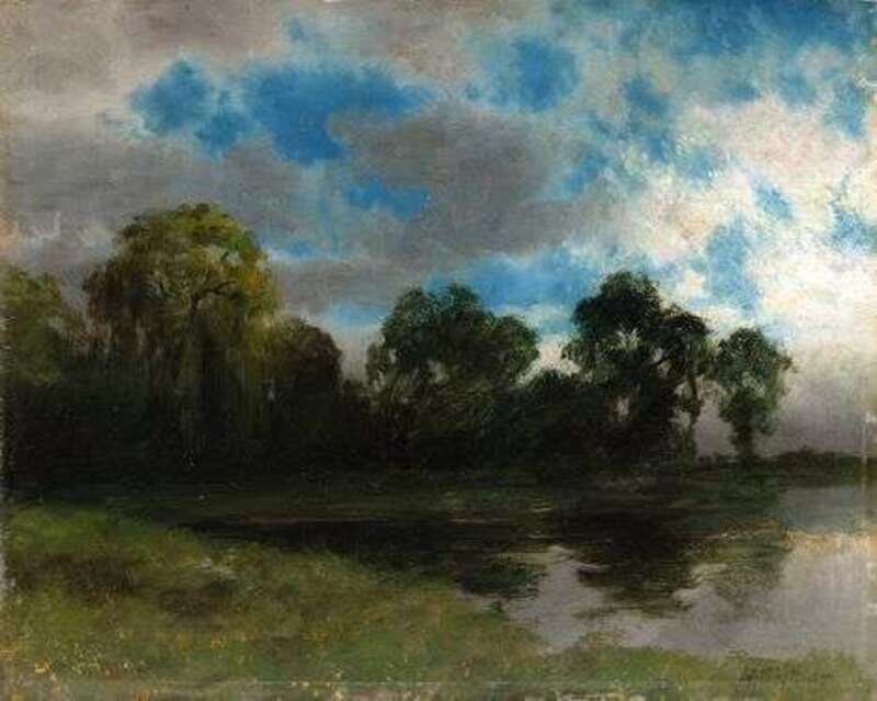ALBERT BIERSTADT (AMERICAN 1830-1902) TREES ALONG A RIVERBANK