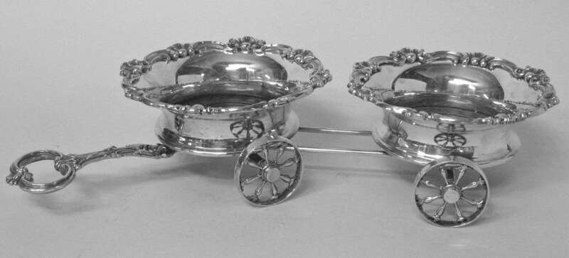 Comprising two wine coasters with scroll cast borders and wood bottoms, mounted to an undercarriage with a scroll cast handle.
