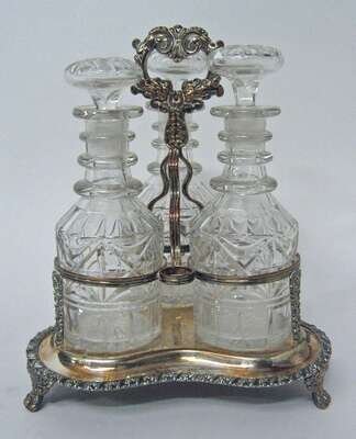 Of triform with a loop scroll handle and with three faceted glass bottles with associated stoppers.