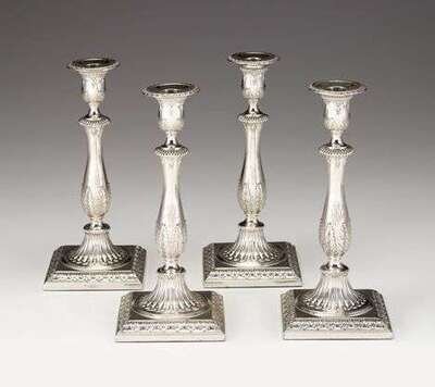 Of baluster form with urn form candle nozzles and acanthus clad square bases, weighted. (4).