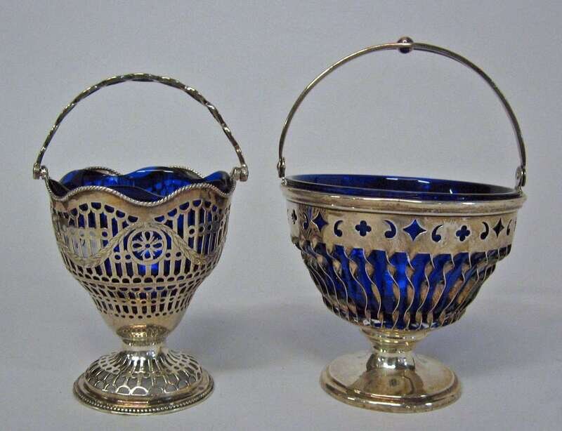 With an entwined handle and pierced body hung with garlands, together with a Black, Starr & Frost sterling silver swing handle basket, each with a later blue plastic liner.