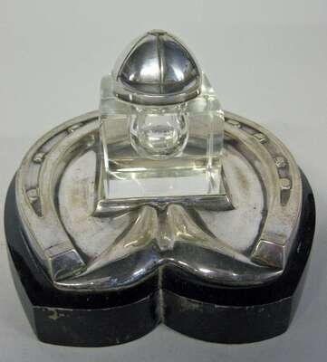 The cubic glass inkwell cover in the form of a jockey's cap, the base in the form of a horseshoe, stamped 'Daniel & Arter' and mounted on a conforming wood stand.