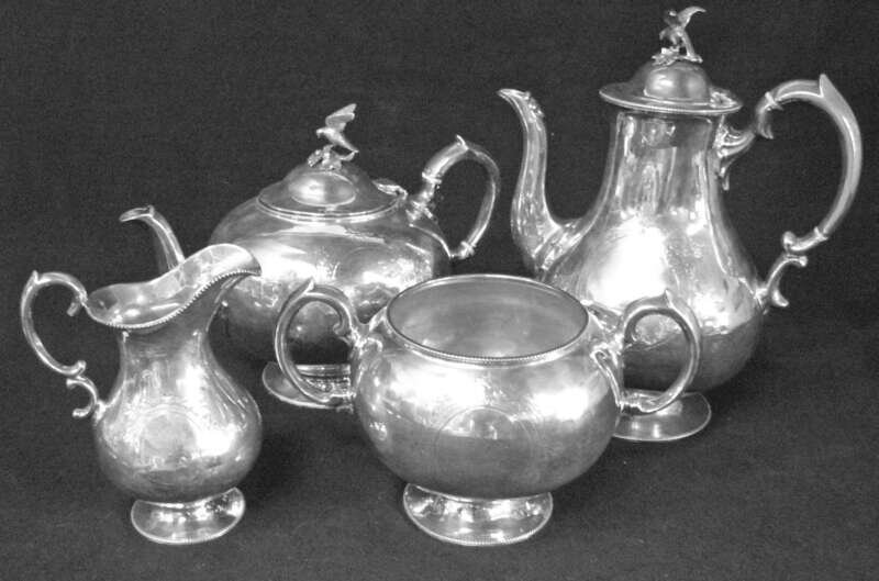 Comprising a pyriform coffeepot, a globular teapot, both with bird finials to the covers, an open sugar bowl and a creamer, all with scroll handles and beaded edges. (4).