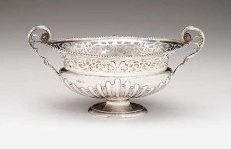 Of flattened campana form, the gadrooned rim over a reticulated scrolling band and lobed body with scrolling handles, raised on an oval stepped base.